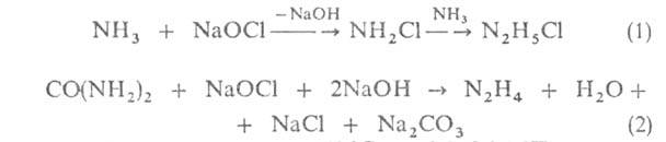 Р-цию (1) проводят при 160°С и 2,5-3,0 МПа, р-цию (2)-при т-ре выше 100oС и нормальном давлении для предупреждения побочной р-ции: 2NH2C1 + N2H4 -> N2 + 2NH4C1 в смесь добавляют, напр., глицерин или желатину. Полученную смесь растворяют в 50%-ной H2SO4 и получают 2-3%-ные р-ры сульфата Г., к-рые затем обрабатывают NH3 и концентрируют (до содержания Г. 60%) дистилляцией при нормальном давлении или в вакууме; 70-90%-ный Г. получают, напр., экстрактивной дистилляцией с анилином, 1,2,6-гексатринитрилом, безводный Г.-обработкой гидразингидрата твердым NaOH с послед. перегонкой над NaOH, вымораживанием конц. водного р-ра Г., пиролизом цианурата N2H4*3HCNO при 147°С. Г. можно также получить р-цией элементного хлора с NH3 при — 30°С, илазмохимическим или радиохимическим разложением NH3.