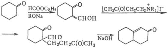 с основанием образуется алкилвинилкетон, к-рый вступает в р-цию c енолят-анионом,